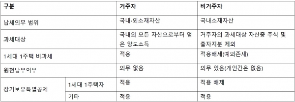 거주자와 비거주자의 경우 양도세 과세에서 아래 표와 같이 많은 차이점이 있다.